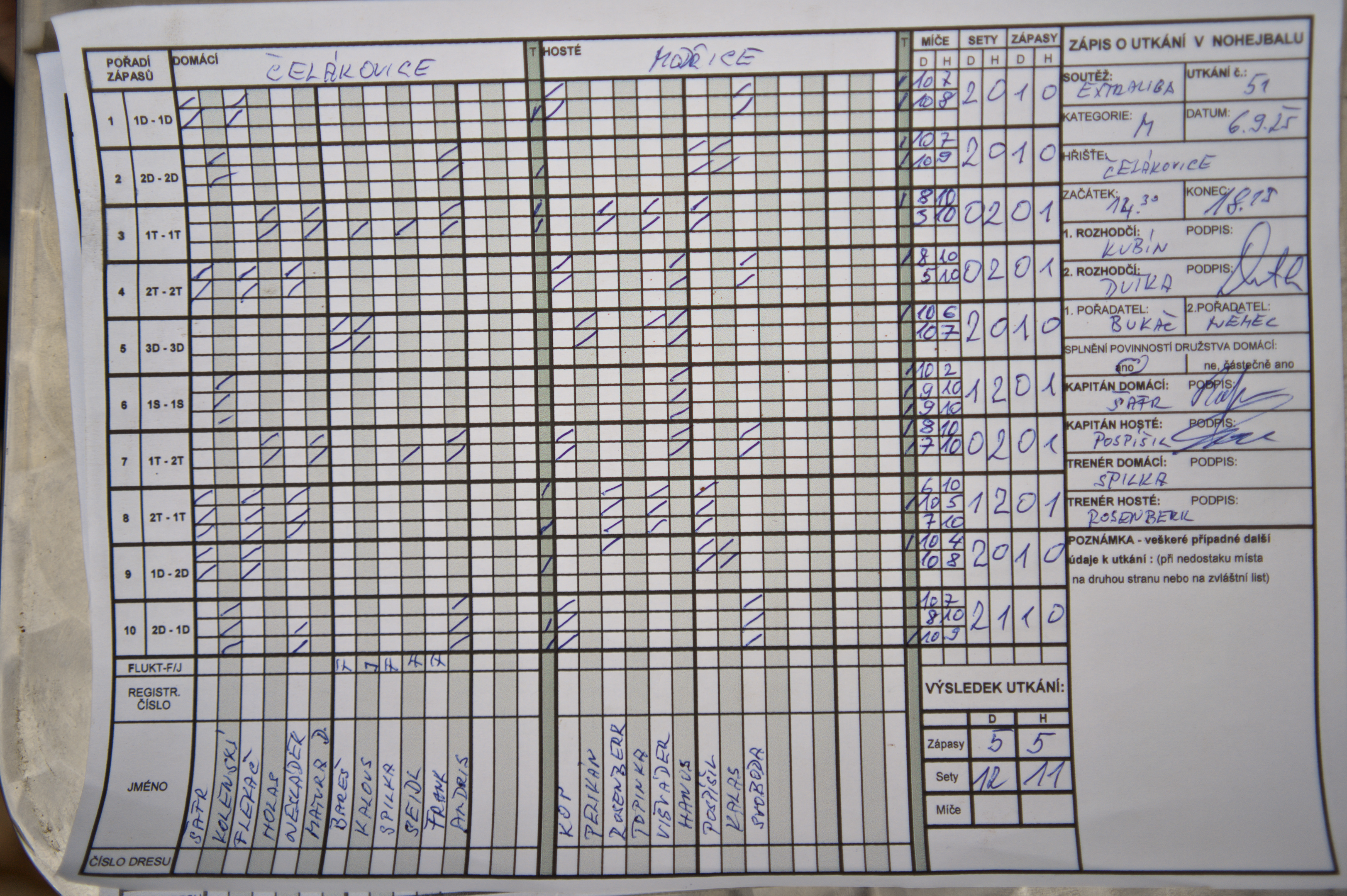 Umístění mají oba soupeři víceméně dané, tak se "o nic" nehraje. Modřice suverénně první bez ztráty jediného bodu, Čelákovice páté. Oba týmy v podstatě komplet vyjma Máry Vojtíška, který letos pro zranění skončil.